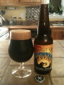 Le lendemain, je n’avais pas envie de prendre un dessert… en fait j’avais envie de prendre un dessert liquide. J’ai donc opté pour la Midnight Sun. Une stout à l’espresso, qui vient du Yukon. Je trouve ça très intéressant que la SAQ puisse se procurer des produits canadiens comme ceux là. J’aimerais bien en trouver plus dans leurs succursales. Bref, la stout a bien fait le travail, le goût de café est très présent, le collet est juste bien, une légère amertume se démarque en finale. Encore une fois, pour le prix, elle en vaut le coup !