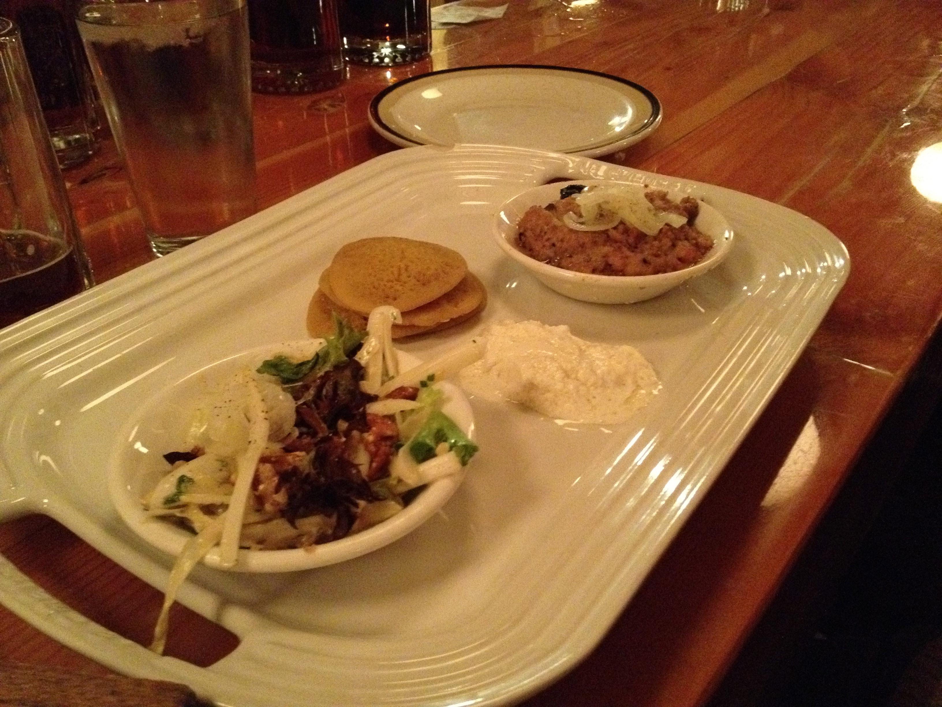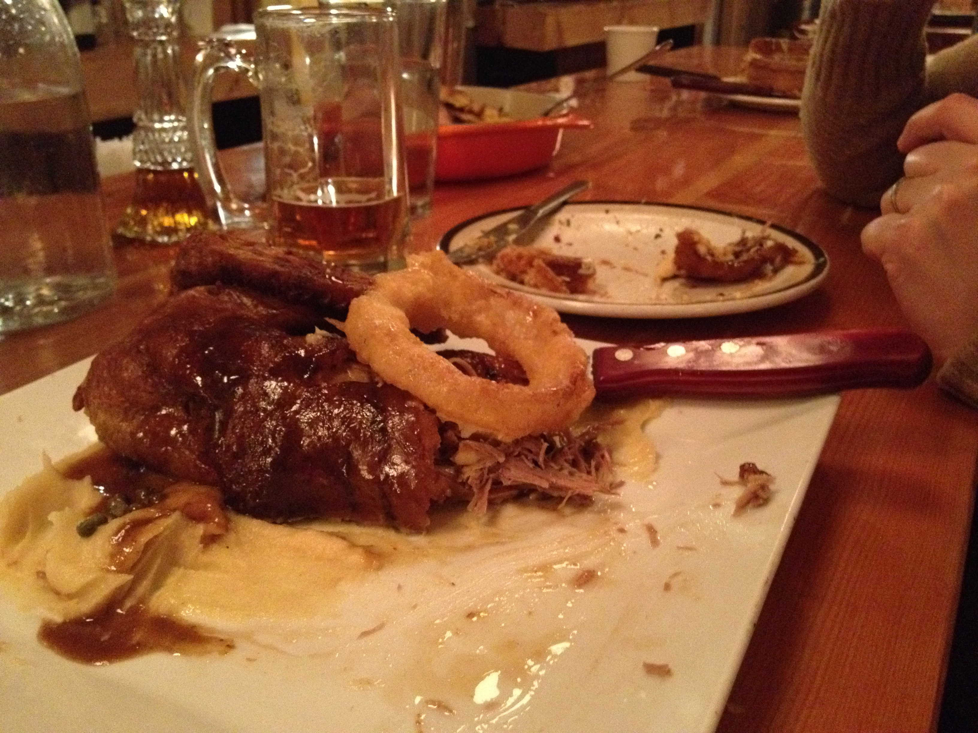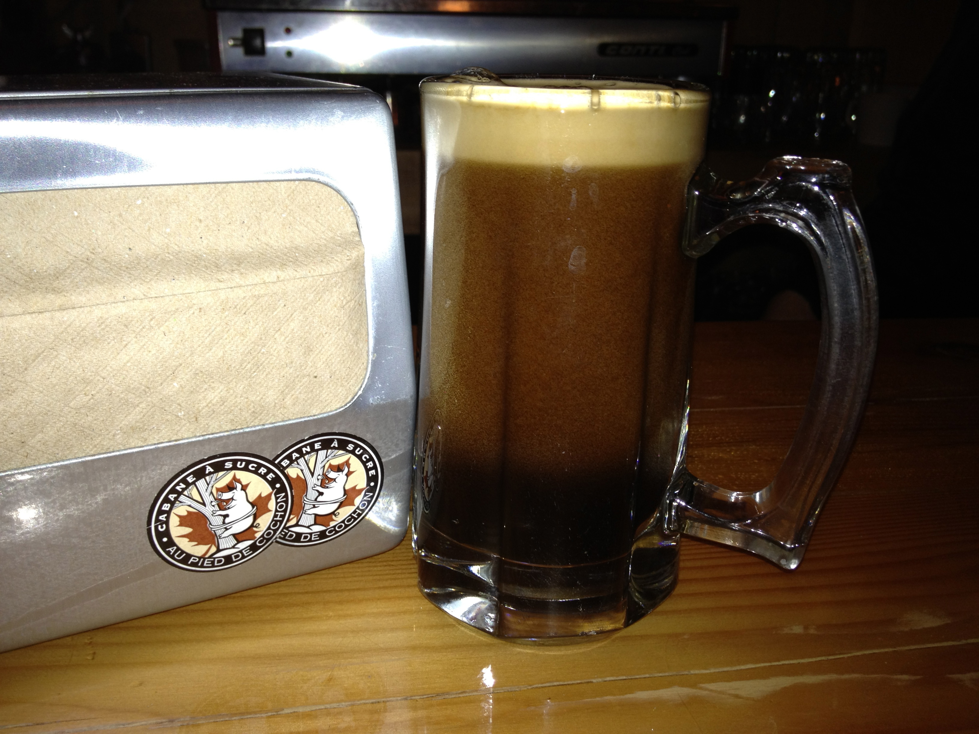 Une amie m’a contacté il y a 2 jours pour savoir si je voulais sa réservation. Pour ceux qui ne le savent pas, on doit réserver un an d’avance. Elle ne pouvait pas y aller, j’ai donc sauté sur l’occasion pour aller faire un tour à cette icône du terroir québécois ! À notre arrivée, une grande salle était remplie de monde, l’ambiance était à la fête, beaucoup de bruit, des odeurs de sirop d’érable et de viande fumée… vraiment invitant ! On avait une place au bar, tout près des lignes de fût. Lorsque la serveuse m’a demandé ce que je voulais boire, j’hésitai car de l’alcool, à la cabane à sucre, je ne suis pas fan de ce mélange. Par contre lorsqu’elle m’a mentionné qu’il y servait les bières de McAuslan, j’étais vraiment content. je me suis donc pris deux Stout St-Ambroise en apéro. Ça s’annonçait une belle soirée.