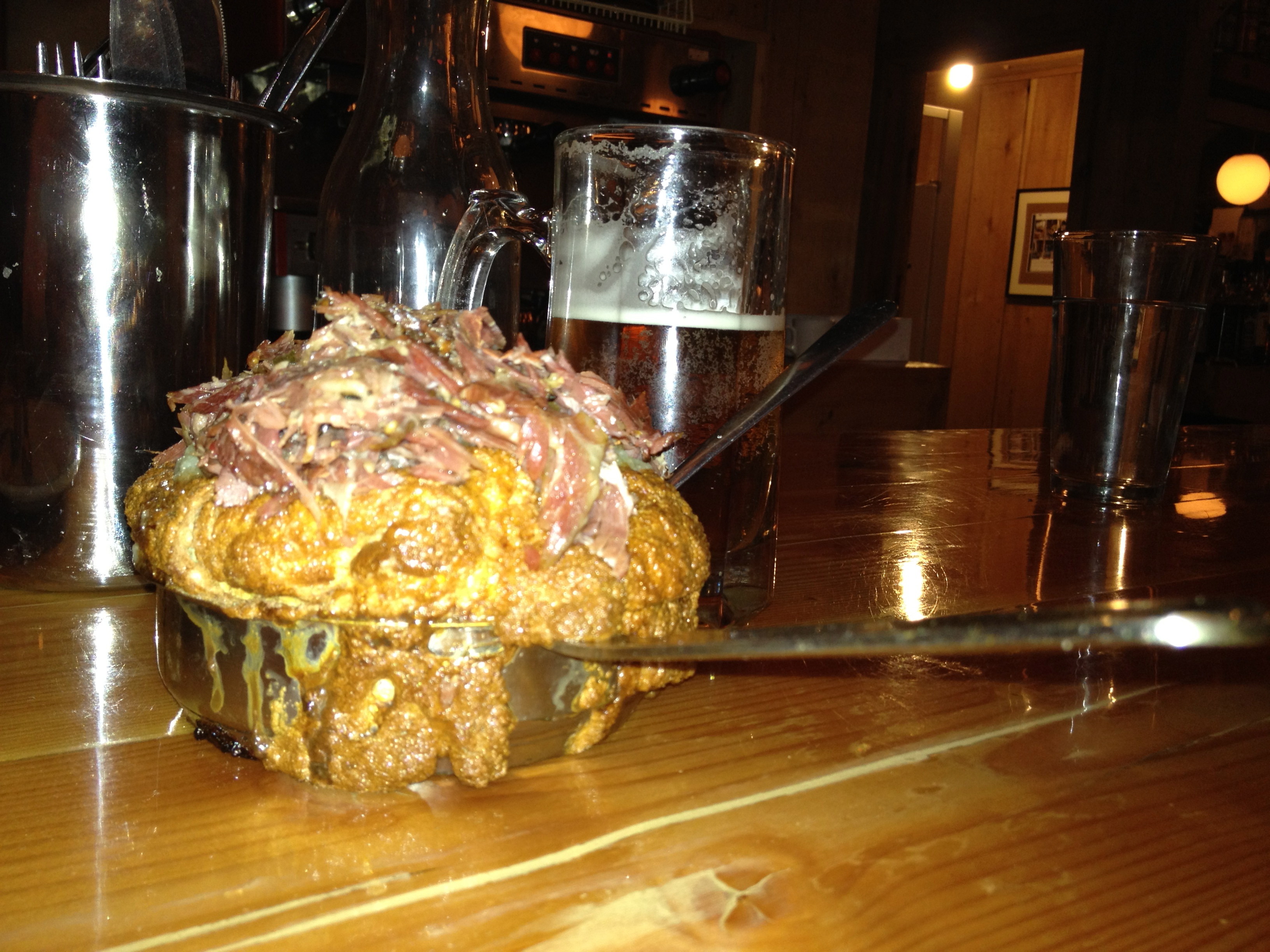 J’ai vraiment aimé le fait qu’on nous offre l’opportunité d’emporter les restants de ce que l’on nous servait. Les quantités sont gigantesques et il aurait été bien dommage de gaspiller tout ce qui ne s,est pas mangé! Il y a aussi le fait que Martin Picard se promène dans la salle, afin de discuter avec les convives, plutôt accueillant ce Martin ! Le prix n’est pas donné, 57$ par personne, mis l’expérience est vraiment sublime, je vous recommande enfin de manger un peu avant et de boire BEAUCOUP d’eau afin de bine préparer votre estomac et surtout afin de vous réveiller bien hydraté le lendemain !!!