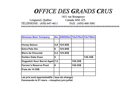 Liste Bières Almanac Brewing / Office Des Grands Crus 2014